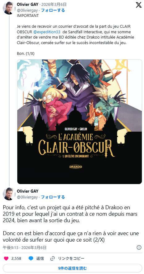 起初3月6日法国漫画家Olivier GAY收到了来自《光与影:33号远征队》开发商Sandfall Interactive法务顾问的销售禁令要求。对方似乎认为他的漫画《L’Académie Clair-Obscur》(光与影学院)是在利用游戏的成功来蹭热度,因为两者的标题部分重合。由于无心对簿公堂,他表示将更改漫画标题后继续连载。值得一提的是,GAY本人似乎是《光与影:33号远征队》的忠实粉丝,甚至已获得该游戏的白金奖杯。