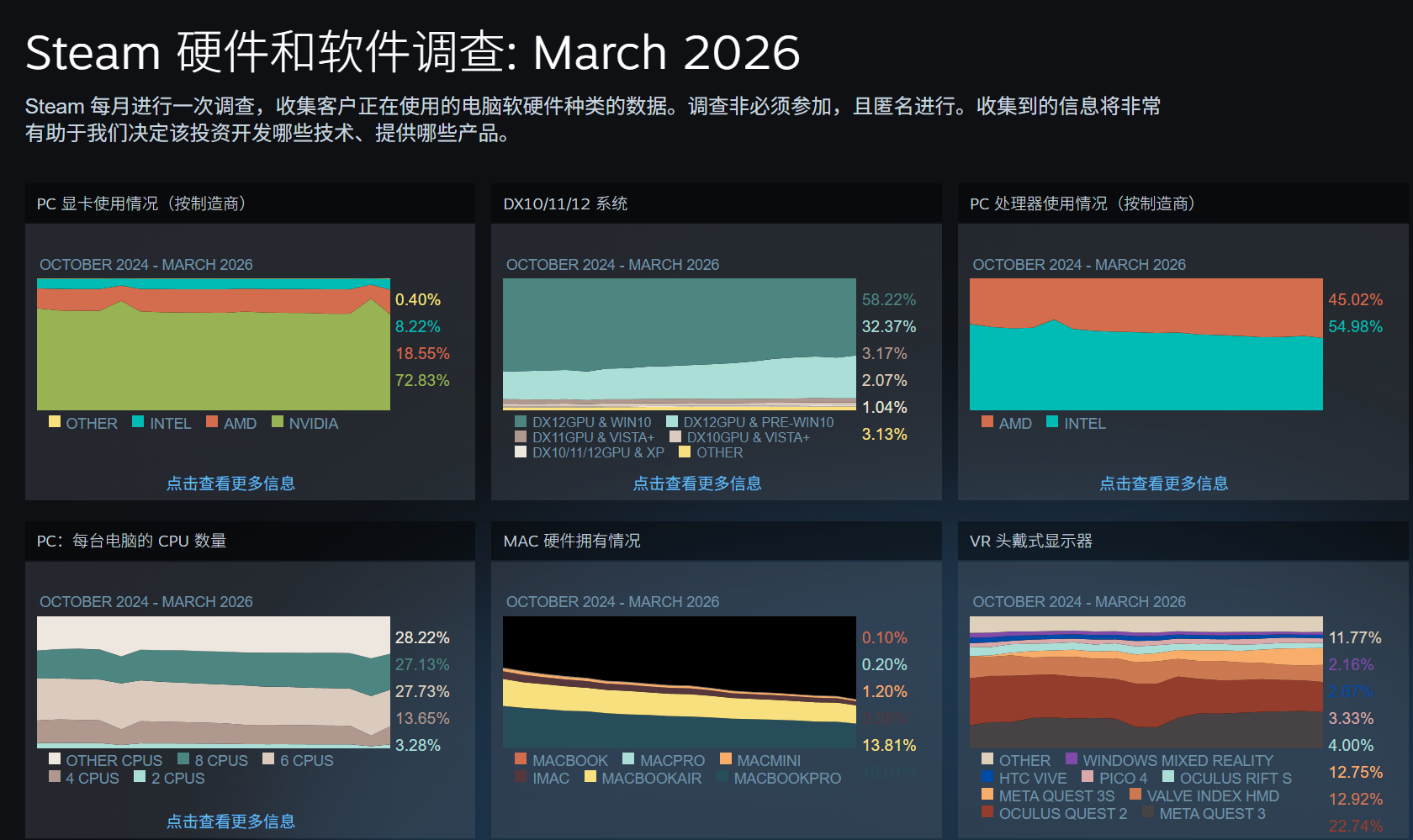 Valve于4月2日发布了《Steam硬件与软件调查:March 2026》。在该调查中,可以看出系统内存的用户比例3月与2月份相比出现了较大变动。