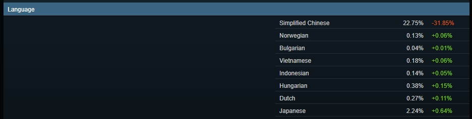 仅从数值来看,这可以说与以往趋势一致。另一方面,值得关注的是各比例与上月(即2月份数据)相比的变化。32GB内存用户较上月减少20.31%,出现骤降。这一变动主要是由于2月份正值春节长假,Steam上中文用户通常会大幅增加。在去年2月的Steam硬件与软件调查中,简体中文用户达到54.6%,在Steam所有语言中占据了压倒性的用户数量。而系统内存方面,32GB用户高达56.93%。
