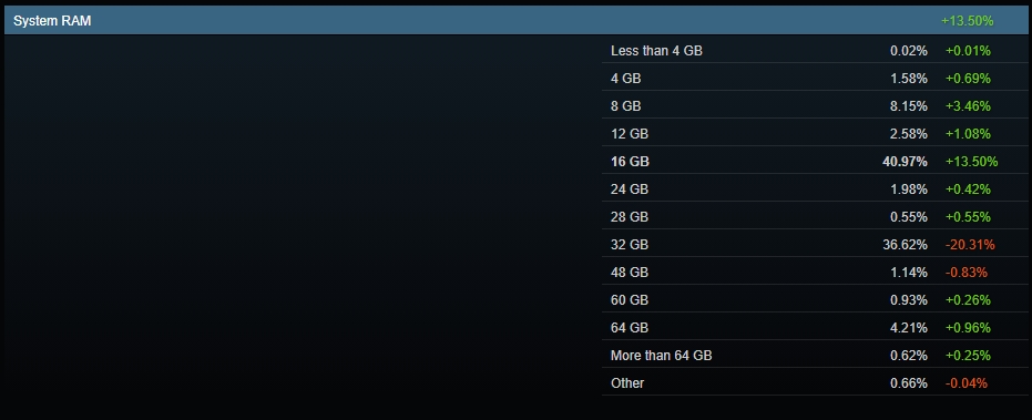 Steam硬件与软件调查中显示,中国用户中“32GB内存”可能已成为主流配置。