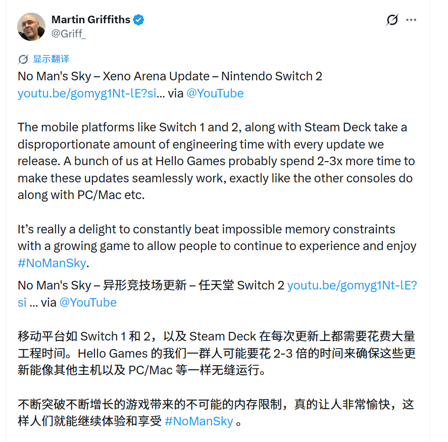 Hello Games开发商于近日发布了Nintendo Switch/Switch 2版《无人深空》的6.3 版本更新“Xeno Arena”。这次担任引擎负责人的Martin Griffiths透露,为Switch版及Steam Deck提供更新所花费的时间,是其他硬件的2~3倍。