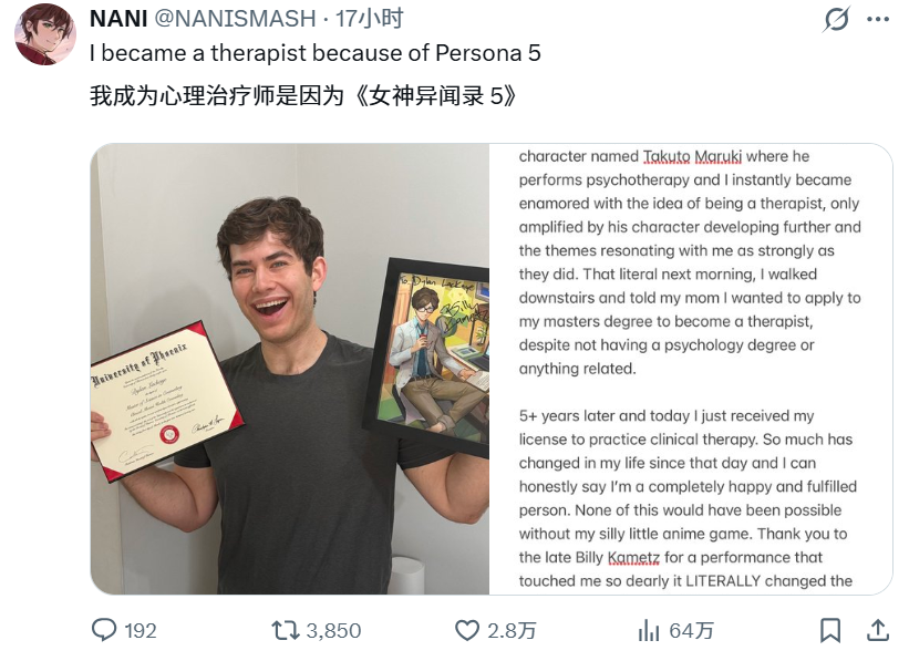 看到丸喜拓人进行心理疗法的场景后,NANI先生被”心理治疗师”这一职业深深吸引。2020年,他当时正处于极度焦虑、自我否定以及对世界的强烈愤怒之中。在玩了《女神异闻录5 皇家版》并遇到这个角色后,他向母亲报告说:”我想为了成为心理治疗师而去读研究生。”当时,他虽然完全没有心理学学位和相关经验,但花了五年时间,最终获得了实践临床心理疗法的资格。他向曾经支持过自己的人以及Billy Kametz表达了感谢。