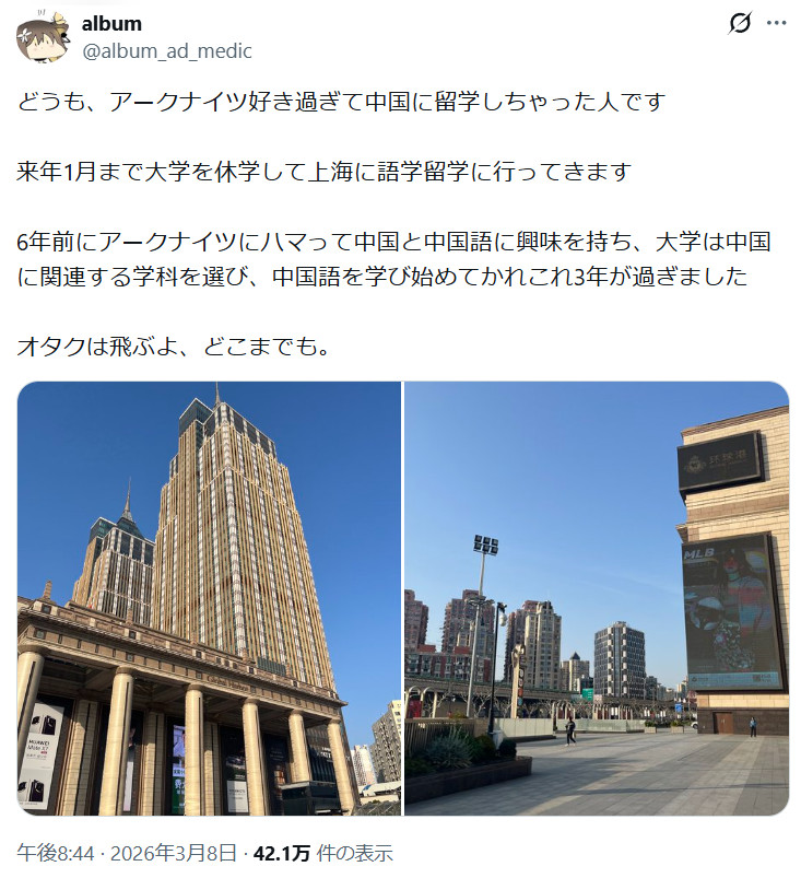 而如今众所周知,中国的游戏特别是二次元游戏发展十分迅猛,在日本可以说也呈现出席卷之势。于是,最近我们碰巧遇到了一位因为喜欢中国游戏《明日方舟》而选择学习中文,并在近期来到中国留学的日本朋友“album”。