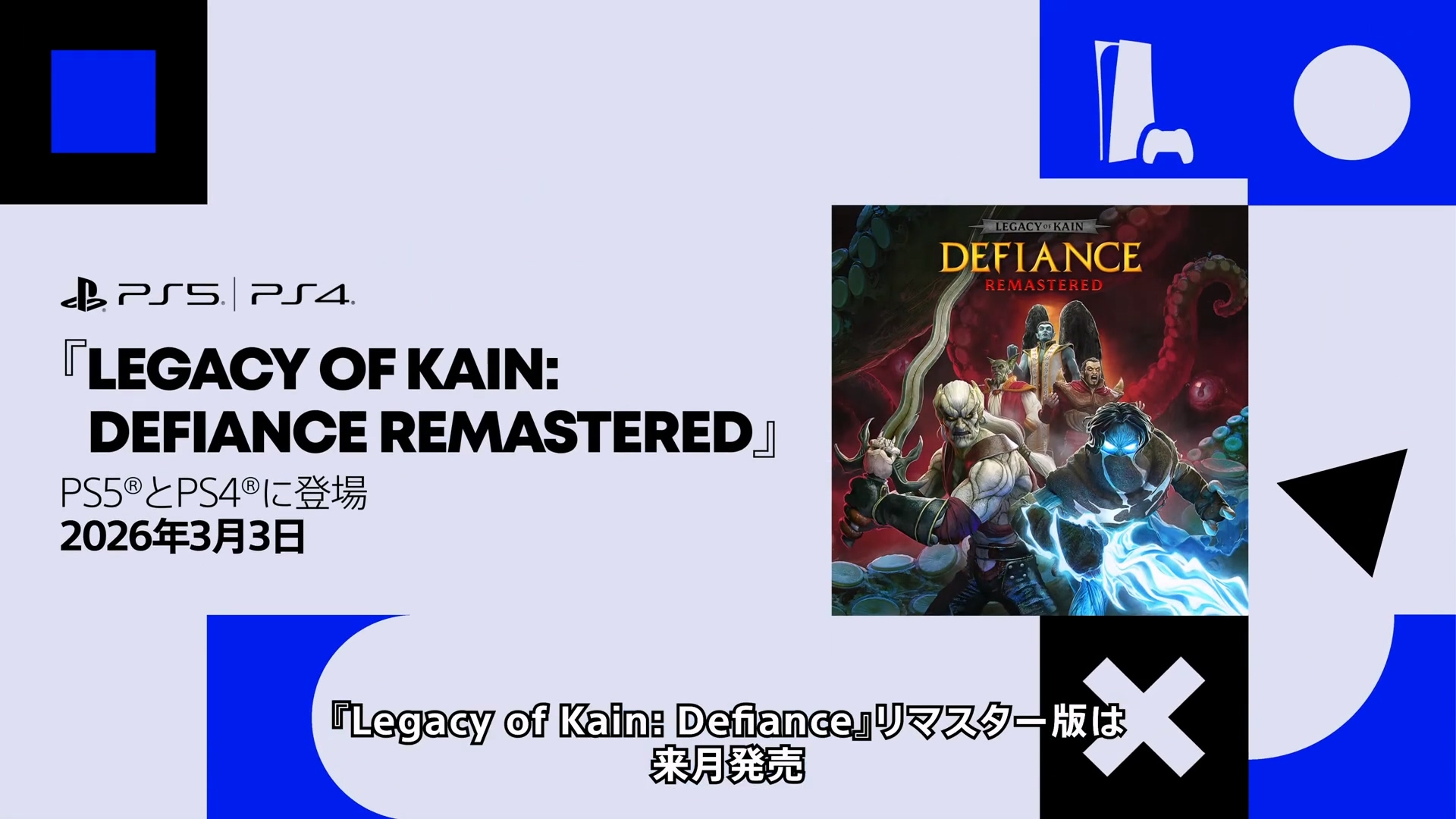 《凯恩的遗产:嗜血狂魔 Remastered》公布,游戏将画面高清化,并加入第三人称视角、导航地图等功能,此外还有新的角色皮肤等内容。本作预定于2026年3月3日登陆PS5、PS4平台。