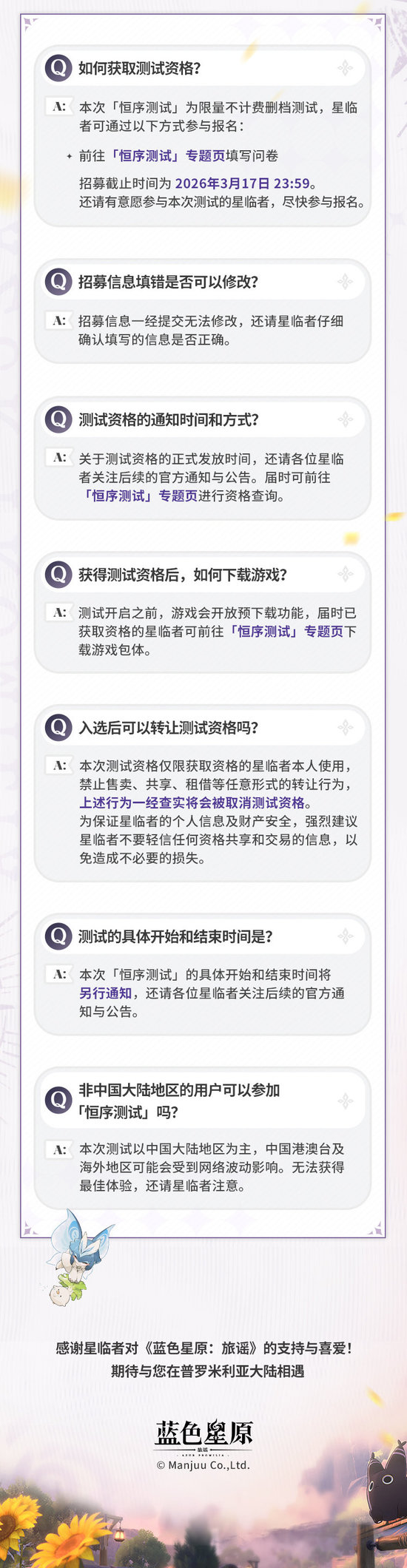 开放世界动作冒险游戏《蓝色星原:旅谣》即将举办“恒序测试”,目前正在招募测试玩家,招募截止时间为3月17日。前往游戏官方网站填写调查问卷即可参与报名。