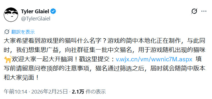 在此通过官方的调查问卷就可以参与。猫名需要尽量控制在2-6个字以内,并可以选择猫咪的性别,同时征集问卷还希望提名者能介绍一下名字的梗或者典故。Tyler Glaiel也希望大家能一起集思广益,大开脑洞。最终猫名经过筛选之后,就会随简体中文更新与大家见面。