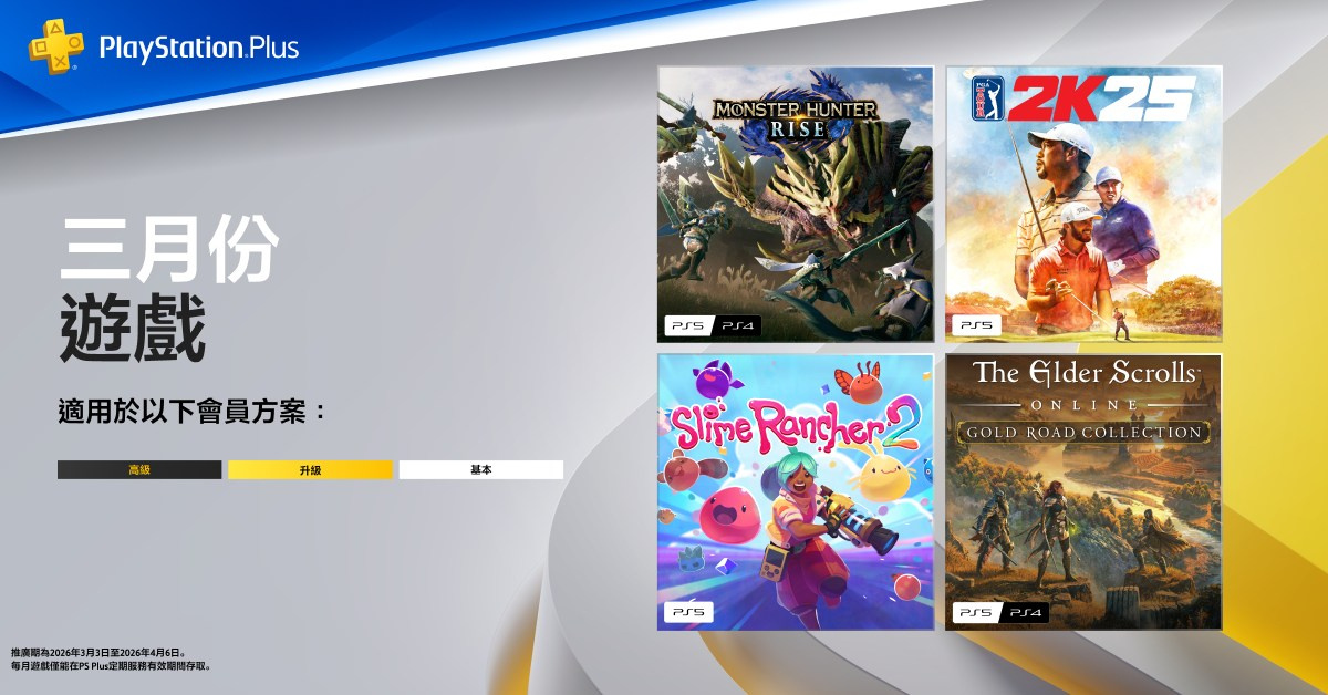SIE公开PS PLUS会员3月份的会员免费游戏:《怪物猎人:崛起》、《PGA Tour 2K25》、《史莱姆牧场2》、《上古卷轴Online收藏版:黄金大道》 。