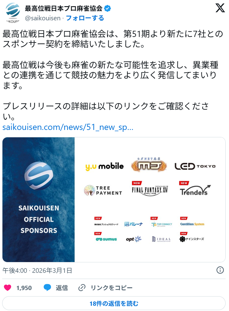 职业麻将团体“最高位战日本职业麻将协会”3月1日宣布,与新的7家公司签署了赞助协议。其中包含了史克威尔·艾尼克斯的《最终幻想14》,而受到广泛关注。