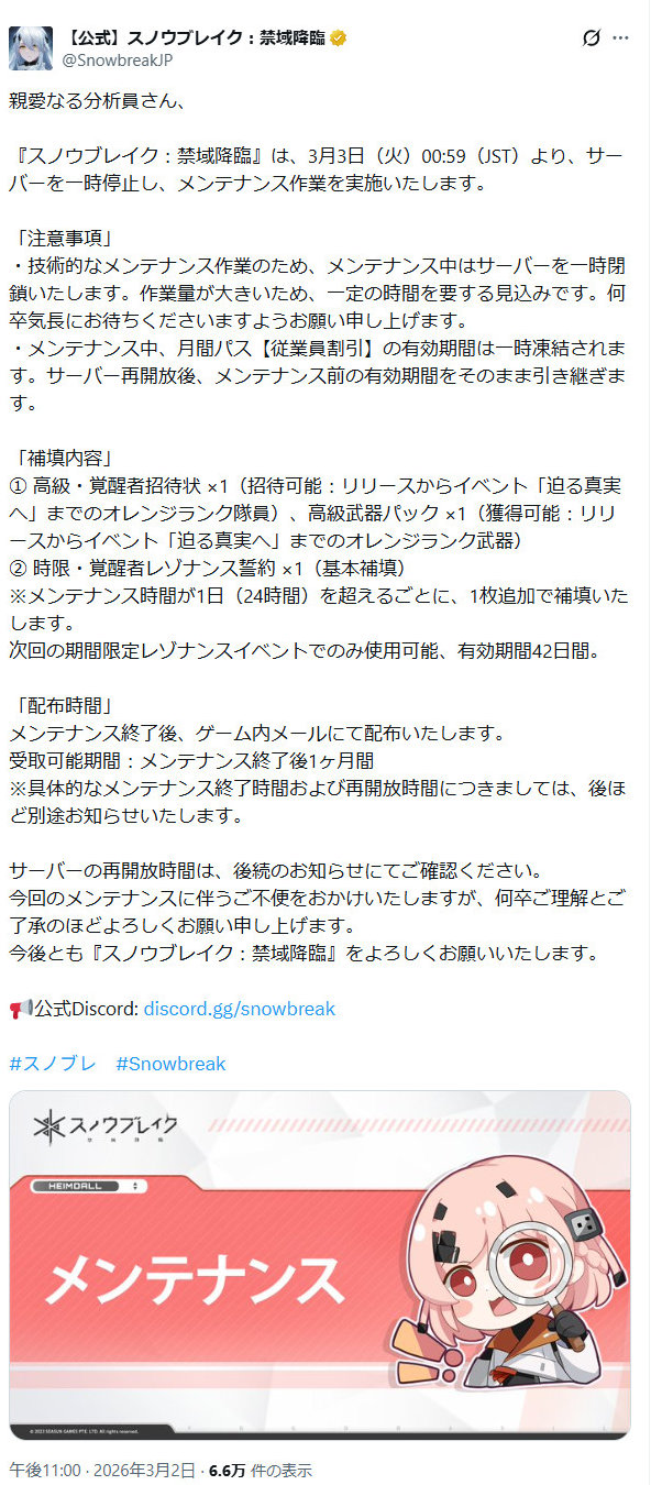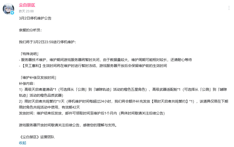 二次元美少女游戏《尘白禁区》于3月2日晚23点突然宣布自3月2日23点59分起,将暂时关闭游戏服务器进入停机维护,且公告中未确定维护结束时间。官方表示这次维护是由于服务器技术原因,且维护周期可能相对较长,还请耐心等待。同时针对这次停机维护,官方给出了十分丰厚的补偿奖励。以下就是公告原文截图: