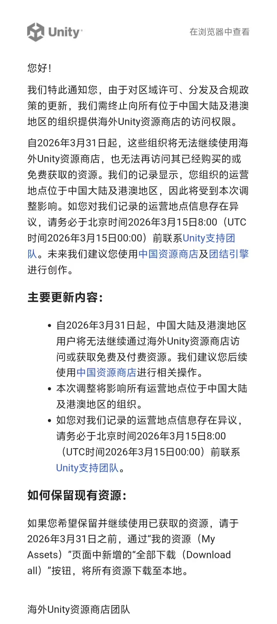 Unity Technologies于3月3日在官方用户论坛”Unity Discussions”上公布,由于对中国大陆及港澳地区发行商相关区域许可、分发及合规政策的更新,自2026年3月31日起,中国大陆及港澳地区用户将无法继续使用海外Unity资源商店,也无法访问免费资源或已购资源。随后官方向已拥有相关资源的Unity用户也收到了发送至其邮箱的通知邮件。