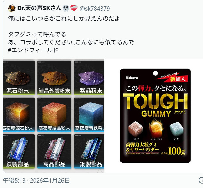 这次联动并不是空穴来风,提到TOUGH GUMMY的软糖这里其实是有个梗。在游戏刚开服没多久,就有不少玩家发现《明日方舟:终末地》当中“致密源石粉末”、“致密晶体粉末”、“致密蓝铁粉末”这几个道具的图标跟TOUGH GUMMY软糖的外观十分相似,一度成为话题,甚至引起了TOUGH GUMMY官方的注意。