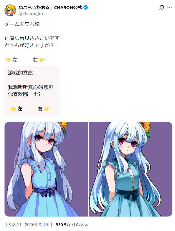 事件起因是3月5日CHARON通过X(推特)发起了一个调查,她给出了两张像素风格的插图,并让粉丝投票选择哪边更好看。经过数日的投票,选择左边的粉丝占到绝大多数。不少意见表示右边的图显得过于精细反而不像是像素风,缺少那种怀旧感和朦胧感。而左边的更适合在游戏里呈现出动态的效果,比较适合有动作元素的作品,右边的则明显更适合出现在视觉小说类游戏当中。