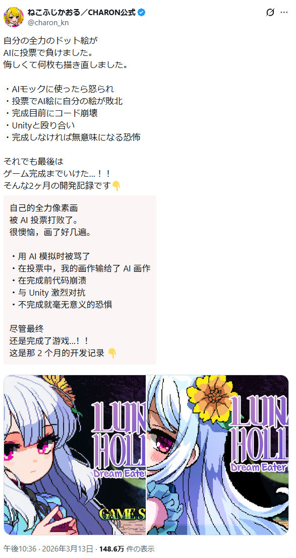 游戏开发者CHARON(ねこふじかおる)不久前做的一项调查引起了话题,原因是他自己精心绘制的像素风插图最终完败于AI。