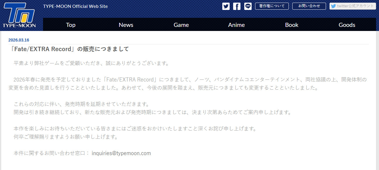 《Fate/EXTRA Record》原本是由TYPE-MOON开发,万代南梦宫发行的作品。最早公布发售窗口是2025年内,后来以需要提升游戏品质为由延期到了2026年春。结果没想到到了2026年3月来了这么一出。