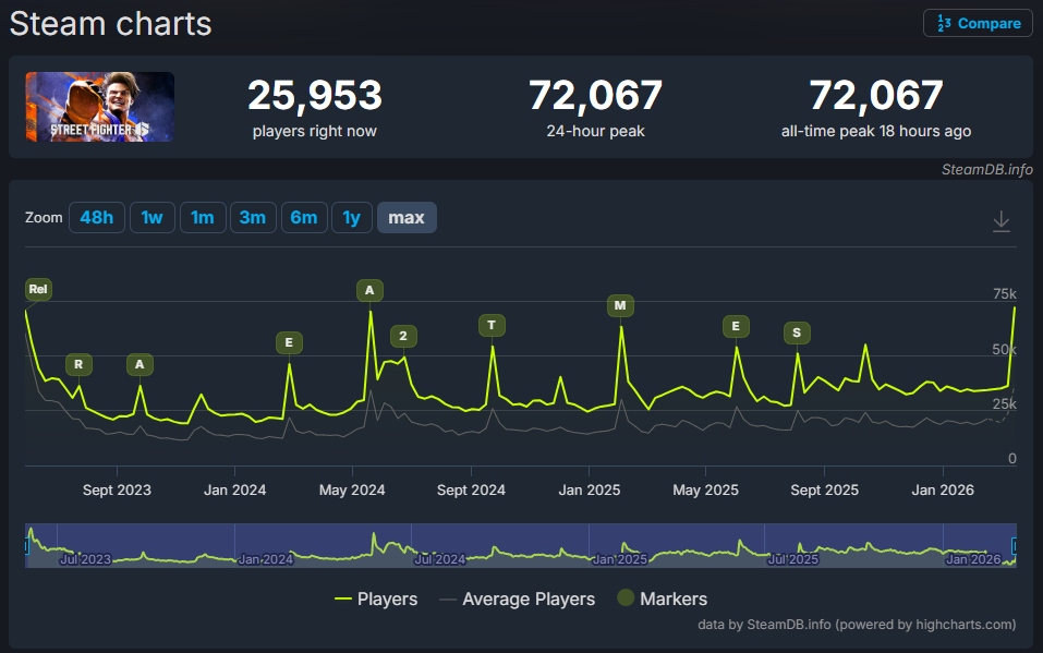 Capcom于3月17日发布了《街头霸王6》的游戏内容更新。此次更新不仅追加了新角色“阿里克斯”,还对全部角色进行了平衡性调整。得益于这次更新,游戏创下了自2023年发售以来,Steam同时在线玩家数达到了约7.2万人。这一数字甚至超过了发售时创下的约7万人记录,成为历史最高在线玩家数。但此时围绕追加的新角色阿里克斯,遭到了部分来自欧美的玩家们的质疑,一时间在网上引发了不小的争论。