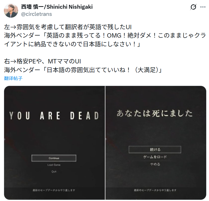 关于UI上外语的去留问题,近期在X上也成为了不少日本人讨论的话题。有日本译者做了强行翻译后的对比图进行调侃,左侧图虽然是翻译时候特意保留了英文,但令人感到遗憾的是,海外发行商未必能够理解,虽然不少日本玩家会认为“带有一定英文的界面更有氛围感”。