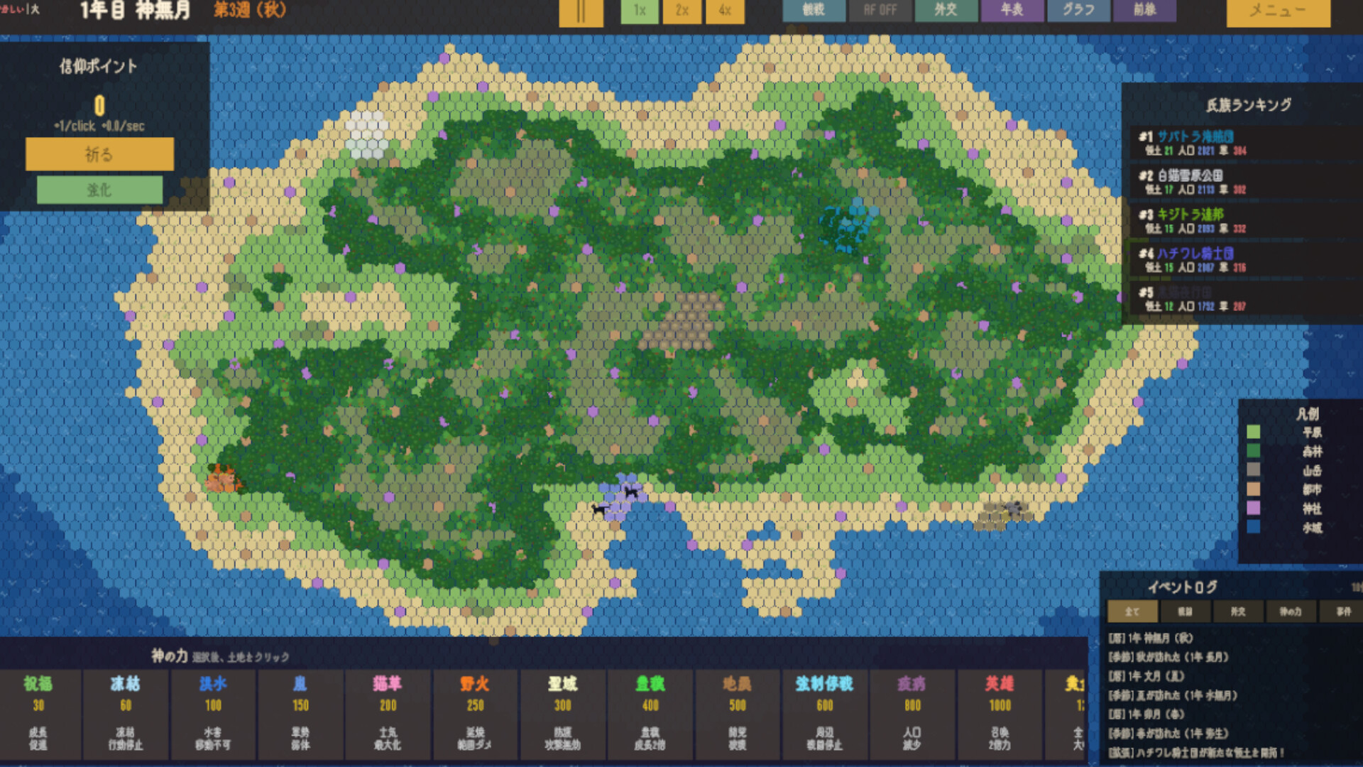 玩家不会直接操作单位,而是作为神明守望这个世界,并通过祈祷获得信仰点来进行干预。游戏的核心乐趣在于观看猫咪们的历史自行发展,适合在工作时放在显示器的一角,偶尔点几下来打发时间。