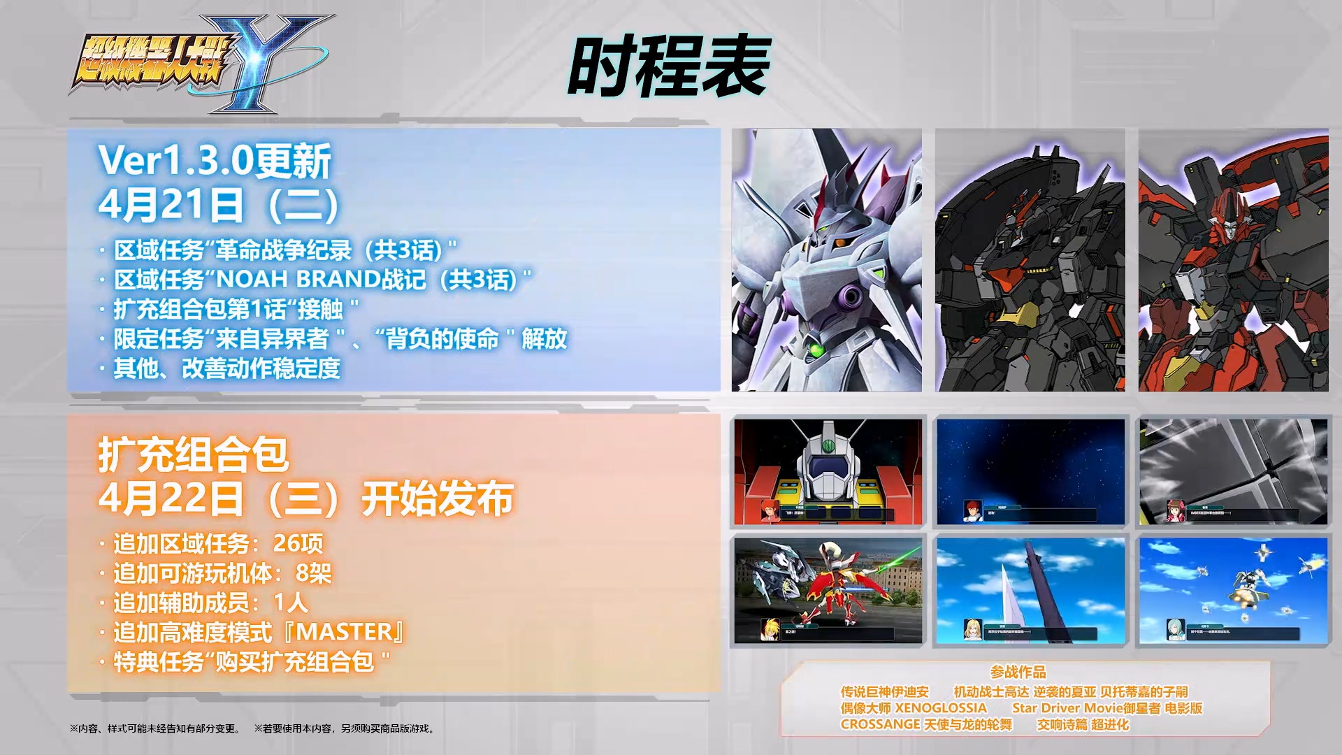此外游戏在4月21日还会推出免费Ver1.3.0版本更新,追加一些新的区域任务并可获得赛巴斯塔和《超级机器人大战V》的主角机体。