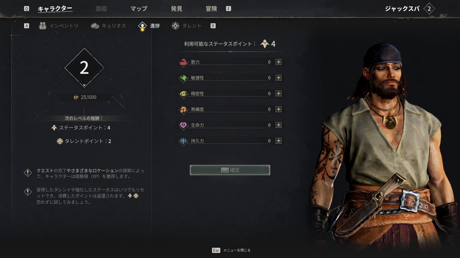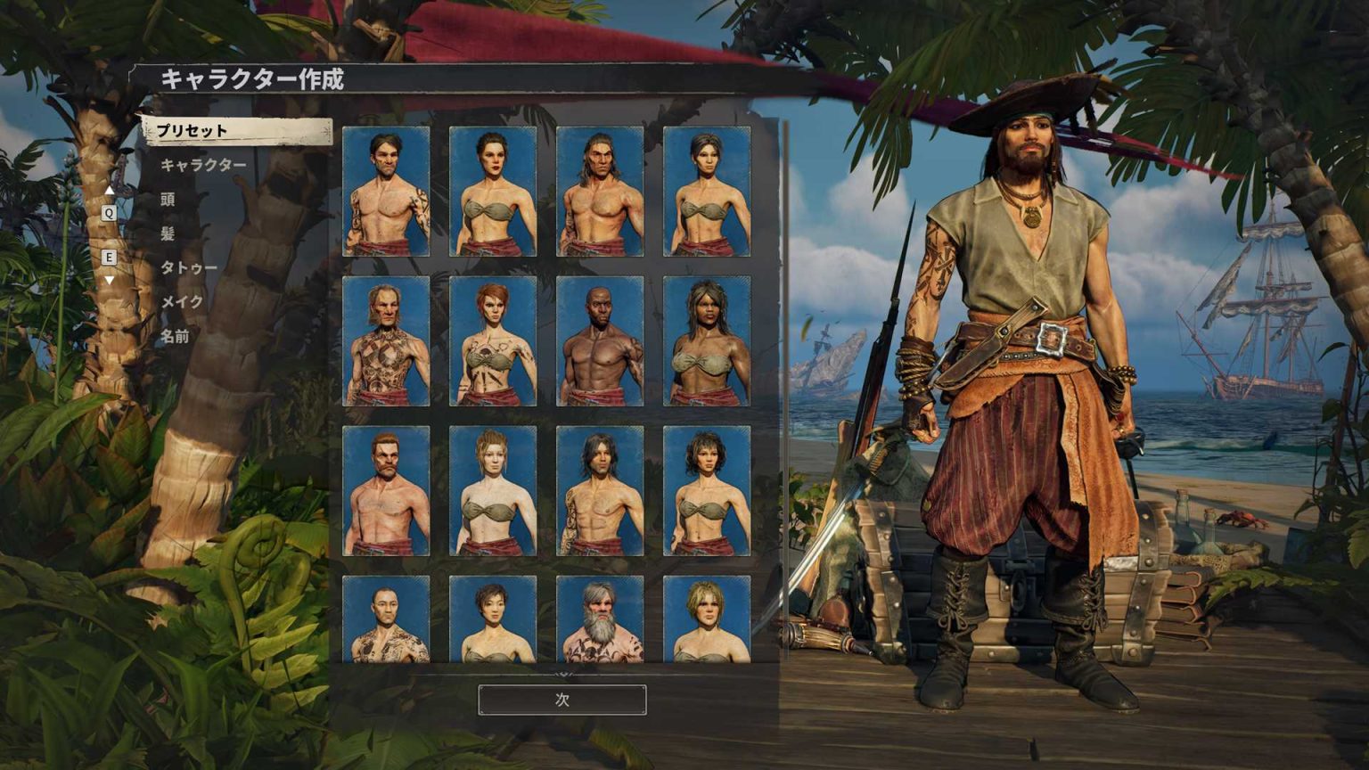 首先来介绍一下游戏初期的流程。启动游戏后,会直接进入角色创建界面。角色造型偏向海盗风格的硬朗设计。笔者平时经常创建女性角色,但这次毫不犹豫地选择了男性角色,捏人灵感来自《加勒比海盗》中的杰克·斯派罗。在本作中,每个角色的养成、装备、船只拥有情况以及任务进度都会被保存,因此即使进入不同的世界,也可以使用同一个角色。玩家可以在单人模式和多人模式之间切换进行游戏,是个非常贴心的设计。当然,如果想从头开始游玩,也可以创建新的角色。