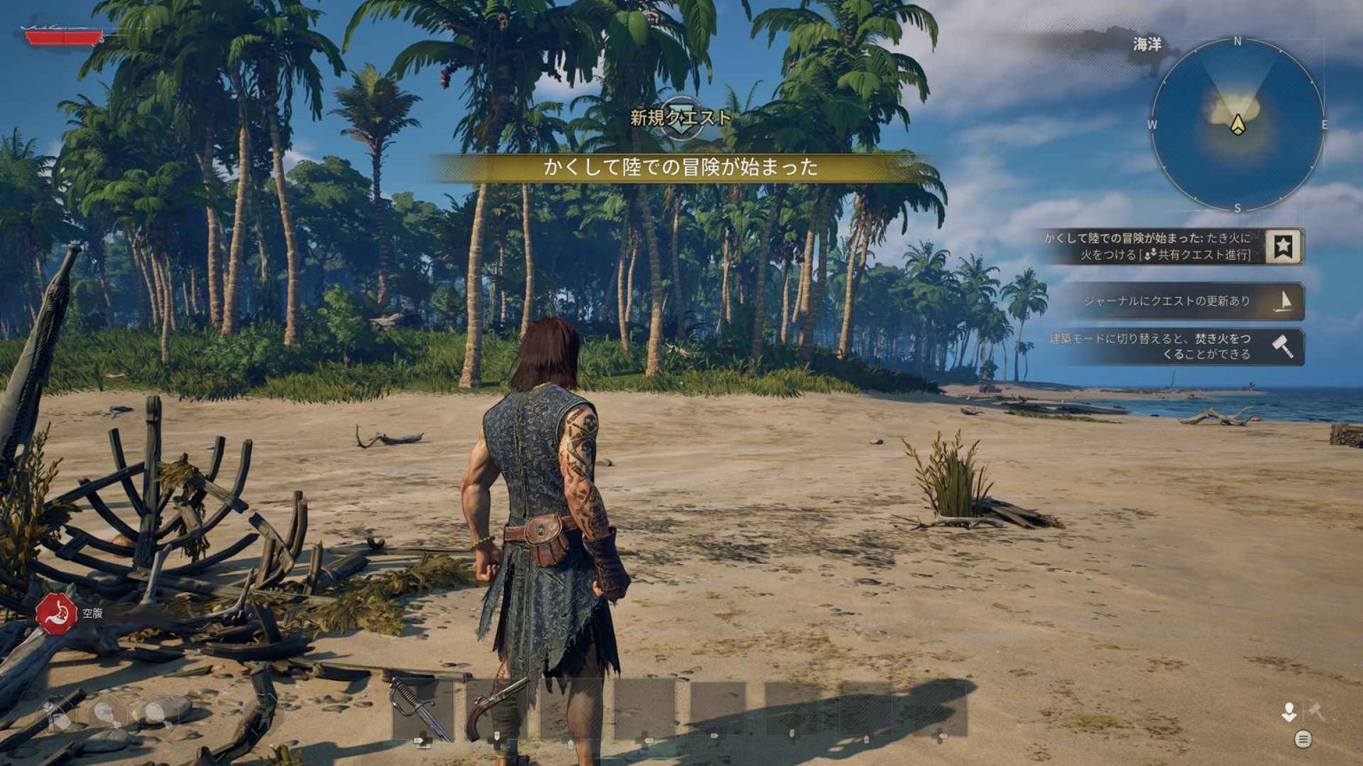 之后,设定世界难度等参数,地图会随机生成,游戏正式开始。开场部分兼作教程,包含完整的导入剧情:主人公被黑胡子袭击后,独自一人在无人岛上醒来,开始真正的生存生活。由虚幻引擎5打造的美丽蓝色大海、天空以及茂密的丛林在眼前展开,加上充满加勒比海与海盗风情的背景音乐,即使身处孤独之中,也能让人情绪高涨。顺便一提,相比试玩版,本作新增了完全手柄操作支持。笔者全程仅使用手柄进行游戏,在上手方面感受到了明显的改进。