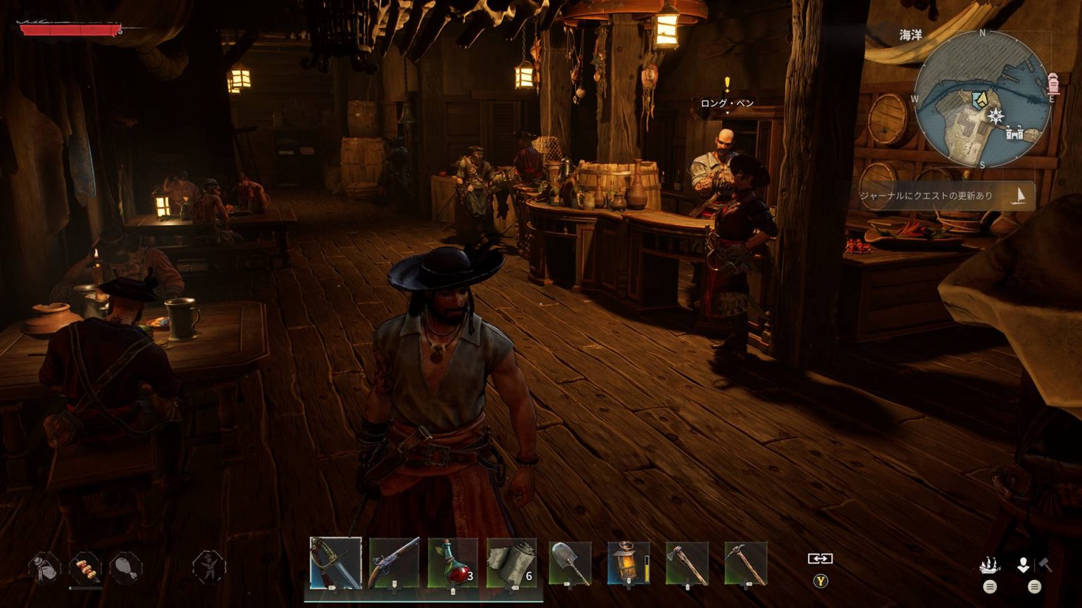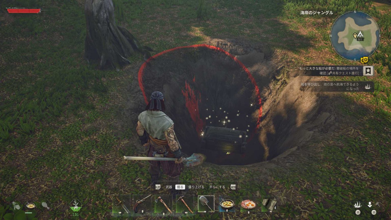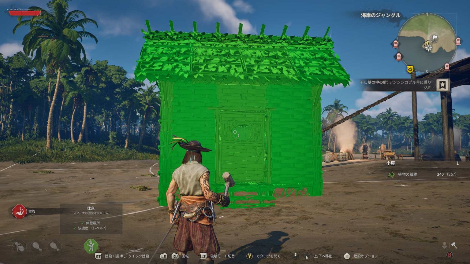 生存建造的系统引导非常清晰,遵循「收集素材→制作工作台→制作装备和据点→扩大探索范围」这一熟悉的流程。只要据点内的箱子里有相应的道具,就可以直接进行制作。建筑的自由度很高,也可以轻松放置预制结构,如果愿意花心思,甚至可以建造出巨大的建筑。此外,还可以使用铲子改变地形。另一方面,本作的生存要素相对轻松。例如,即使感到饥饿,生命值也不会持续减少;不睡觉也不会产生负面效果。食物不会腐坏,工具和装备也没有耐久度,更不存在负重概念。玩家只需要管理好背包即可,整体设计让玩家能够专注于海盗体验。