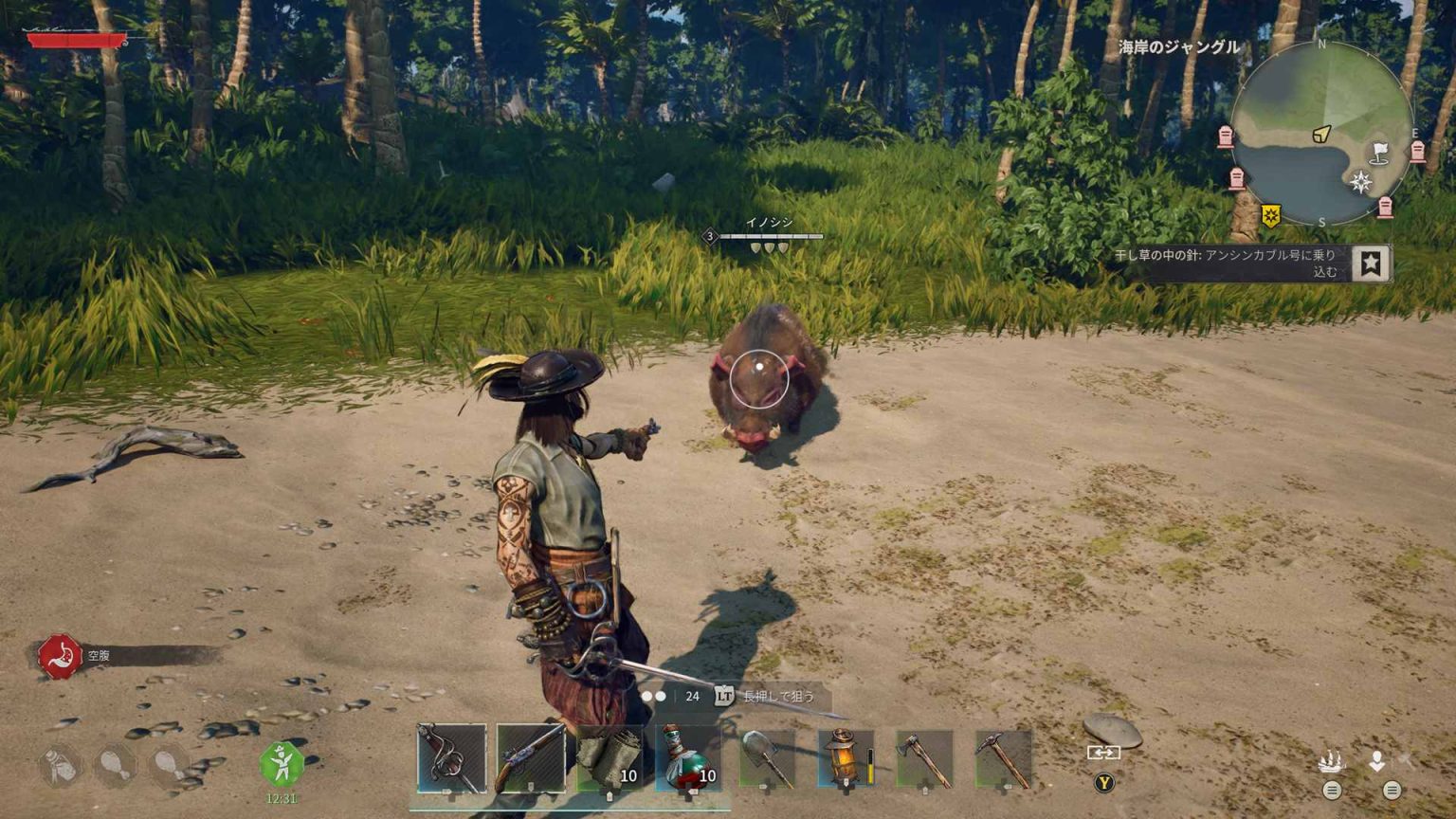 相较于轻松的生存要素,本作的战斗系统则被称为类魂硬核动作玩法,从初期开始就毫不留情。近战武器有弱攻击和强攻击之分,枪械需要消耗子弹和火药。如果使用单手剑和单手枪,可以双持装备,尤其是单手枪的射击动作非常有海盗范儿,笔者非常喜欢使用。此外,玩家和敌人都拥有与生命值不同的「体干(防御槽)」。如果格挡攻击,体干会被削减,归零后会在一定时间内陷入毫无防备的状态。取而代之的是,若能成功使出「精准格挡」(弹反),则不会消耗自身体干,同时还能削减敌人的体干。本作的战斗设计以弹反为前提,就连最初需要收集其皮毛的野猪,都会让玩家倒下几十次,难度相当高。当面对两个以上的敌人时,如果不边跑边逐个击破,很难获胜。