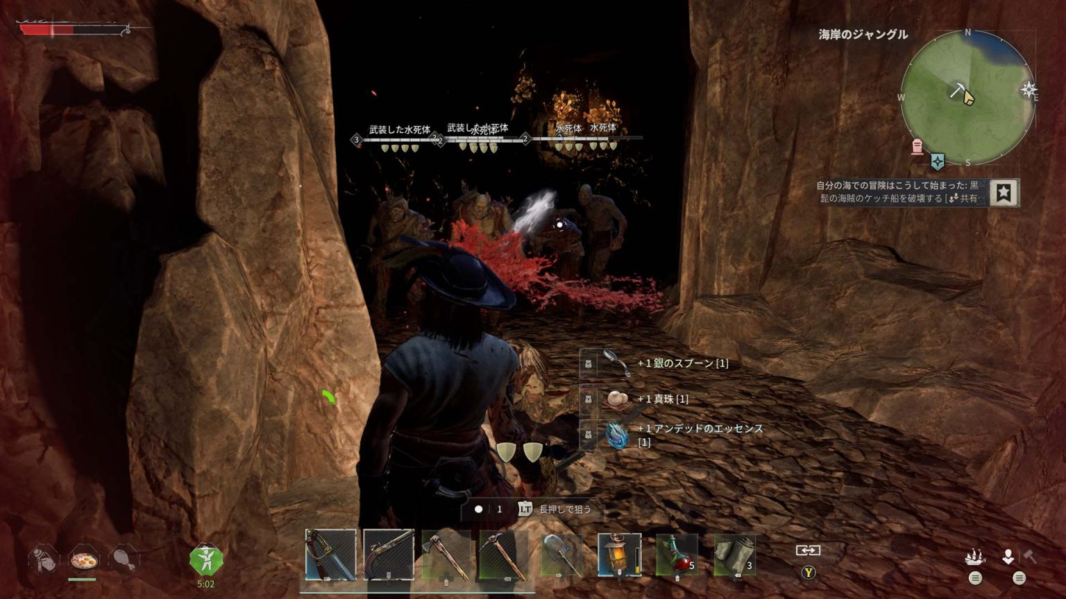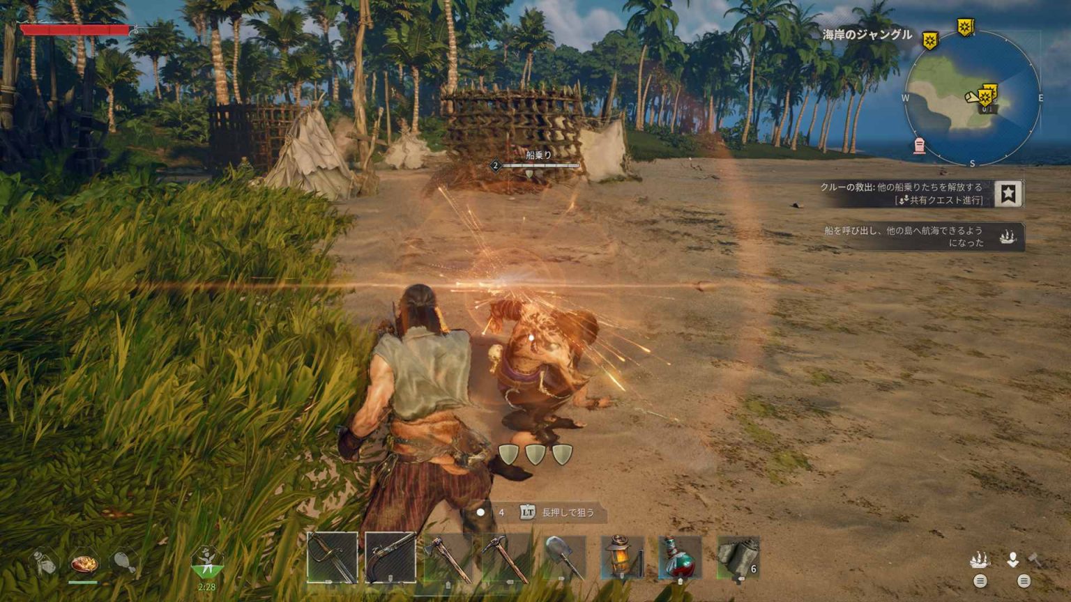 当玩家初步探索完第一座岛屿时,角色大概会升到2级,随后一名船医会不知从何处来到据点。通过船医,玩家可以了解到与剧情相关的黑胡子的动向、亡灵出现的原因,此外还会得知附近岛屿有一艘废弃船只,以及有船员被俘虏的消息。从这一刻起,真正的海盗冒险便开始了。玩家准备好皮装和铜装,划着一艘小船驶向大海。不过,仅凭一艘小船作为海盗还远远不够。在下一座岛屿上,有一艘大型废船,玩家需要收集素材来修理它。此外,在笔者的游戏中,附近多个岛屿上都有被俘虏的船员,因此玩家需要周游各个岛屿,救出船员。这正是一种重建海盗团的体验。当然,大量敌人正在等待着玩家,从这一阶段开始,笔者便采用了搭建帐篷反复复活的「僵尸战术」来渡过难关。