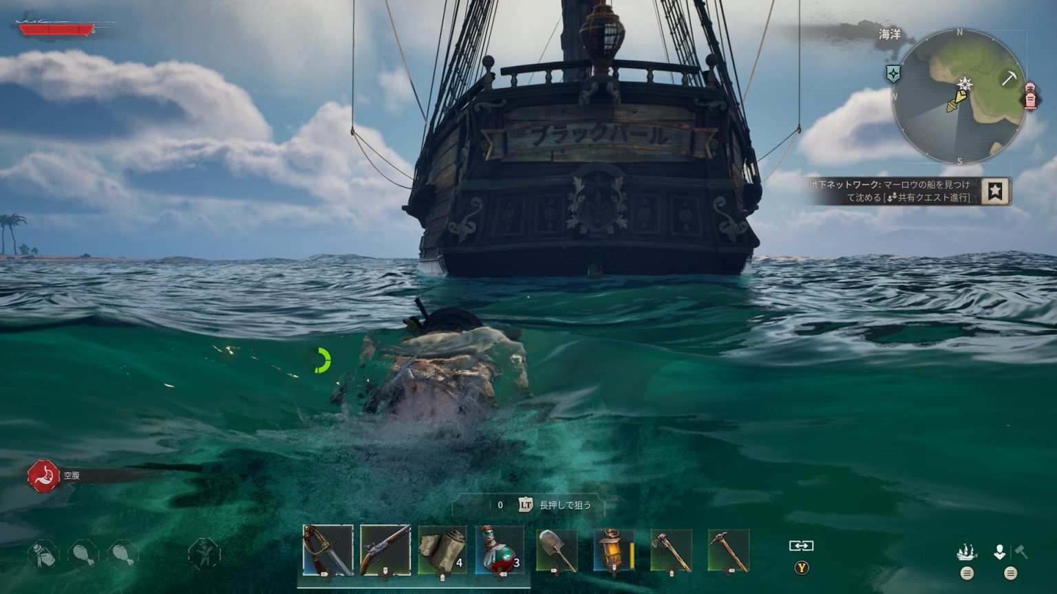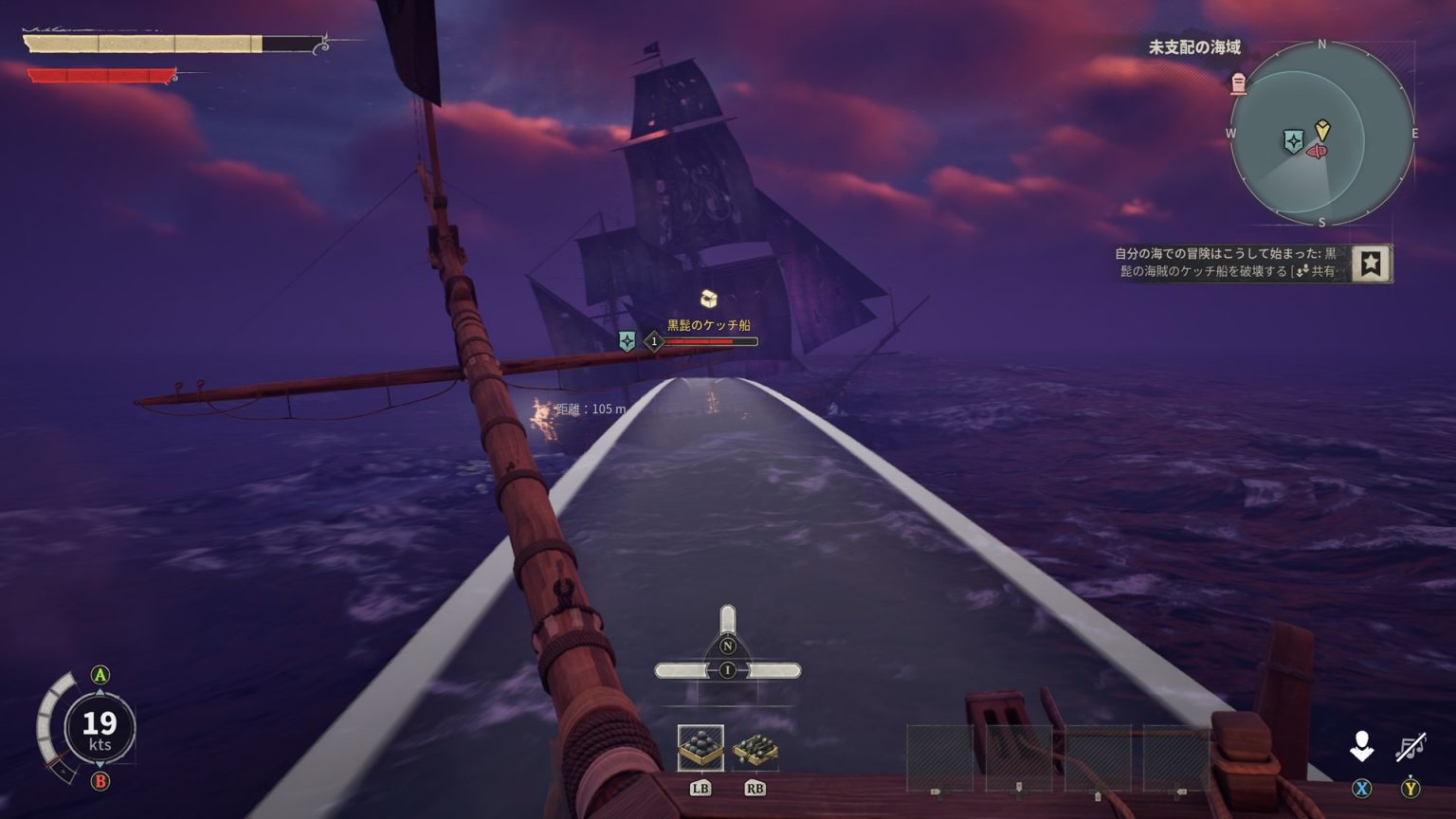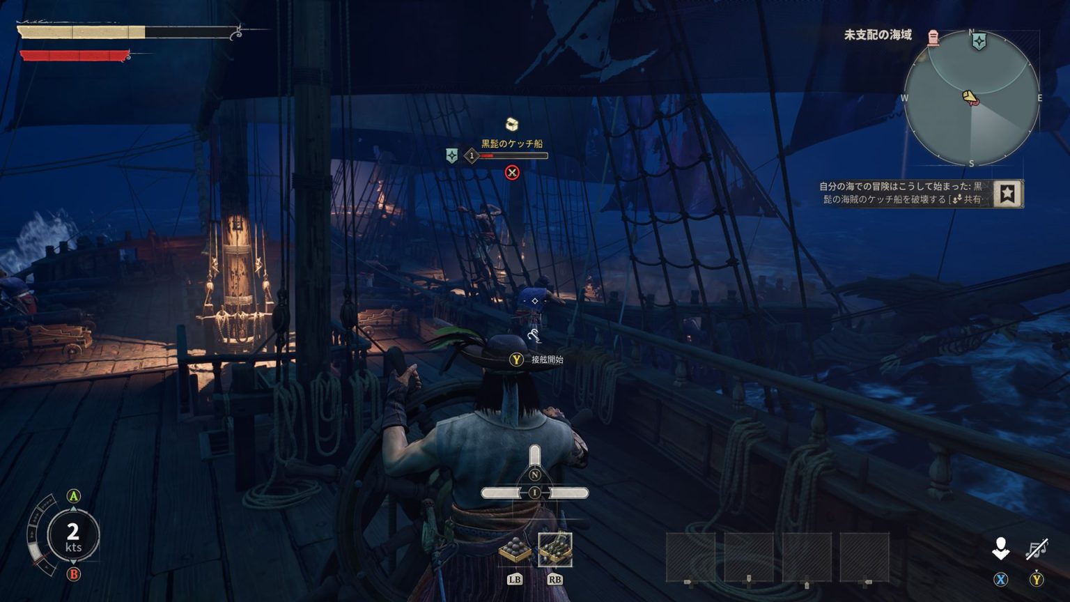 救出所有船员后,玩家便可以在海岸线上随时召唤船只,终于可以驾驶大型双桅帆船出海了。此外,通过据点中的设施,玩家可以自定义船只的外观,并强化大炮、耐久度以及船员能力。船名也可以更改,笔者毫不犹豫地将其命名为「黑珍珠号」。船名会显示在船尾,这种拥有专属海盗船的感觉令人十分愉悦。
