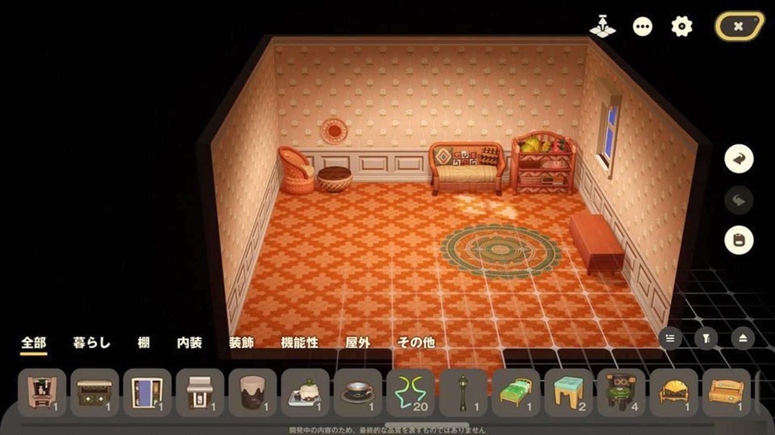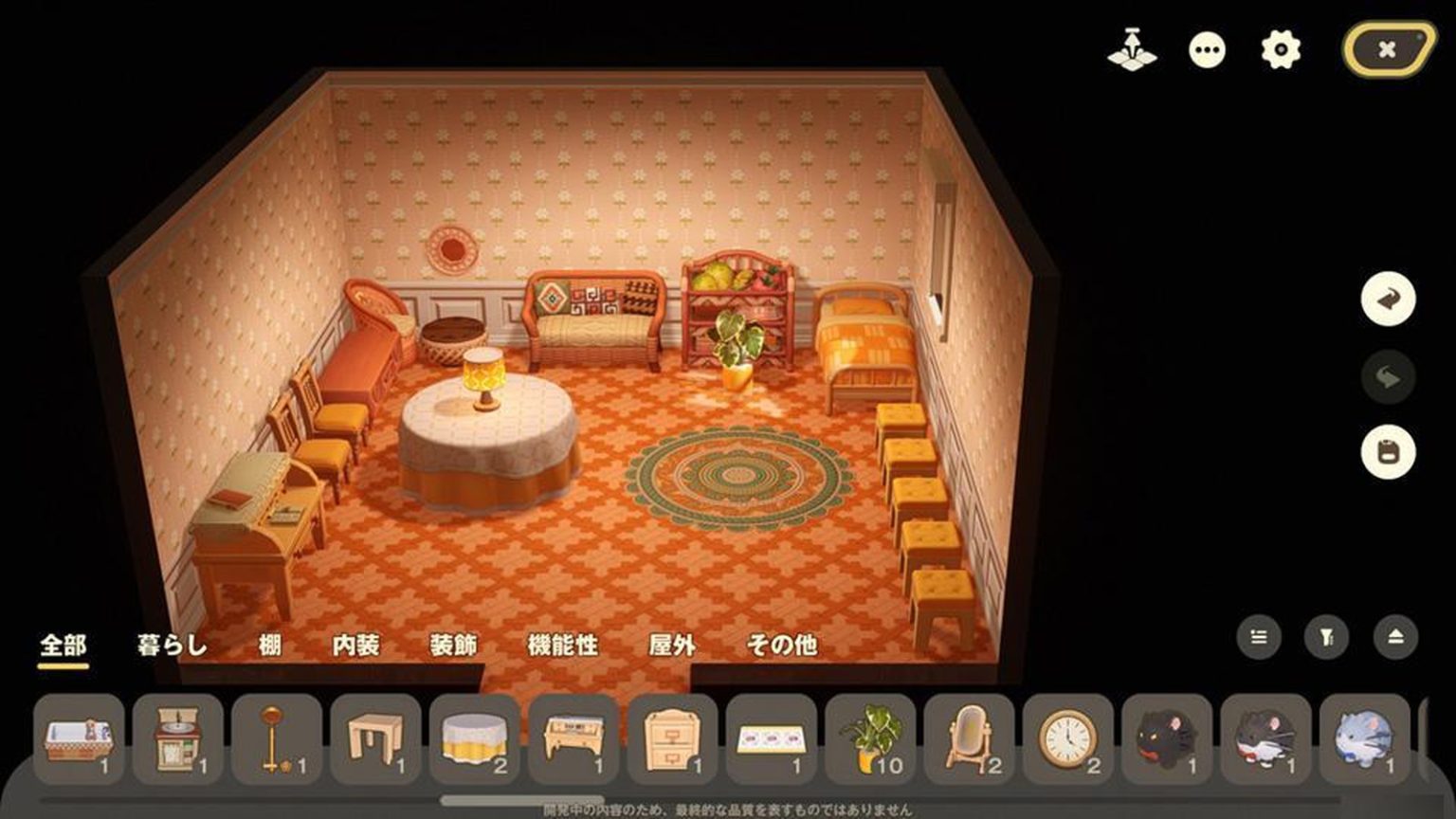 接下来是拼图游戏。开始摆放精心制作而成的室内装饰品吧。重要的是想象自己在这个房间里想要过怎样的生活。我在现实昏暗的房间里拼命开动脑筋,搭建一个舒适的个人空间。一开始空荡荡的家,每摆放一件家具,就多一分生活气息。统一氛围果然也很重要,用统一的巴里迪系列,似乎营造出了一种度假胜地的感觉……大概。这样一来,说不定一次就能达成目标分数。