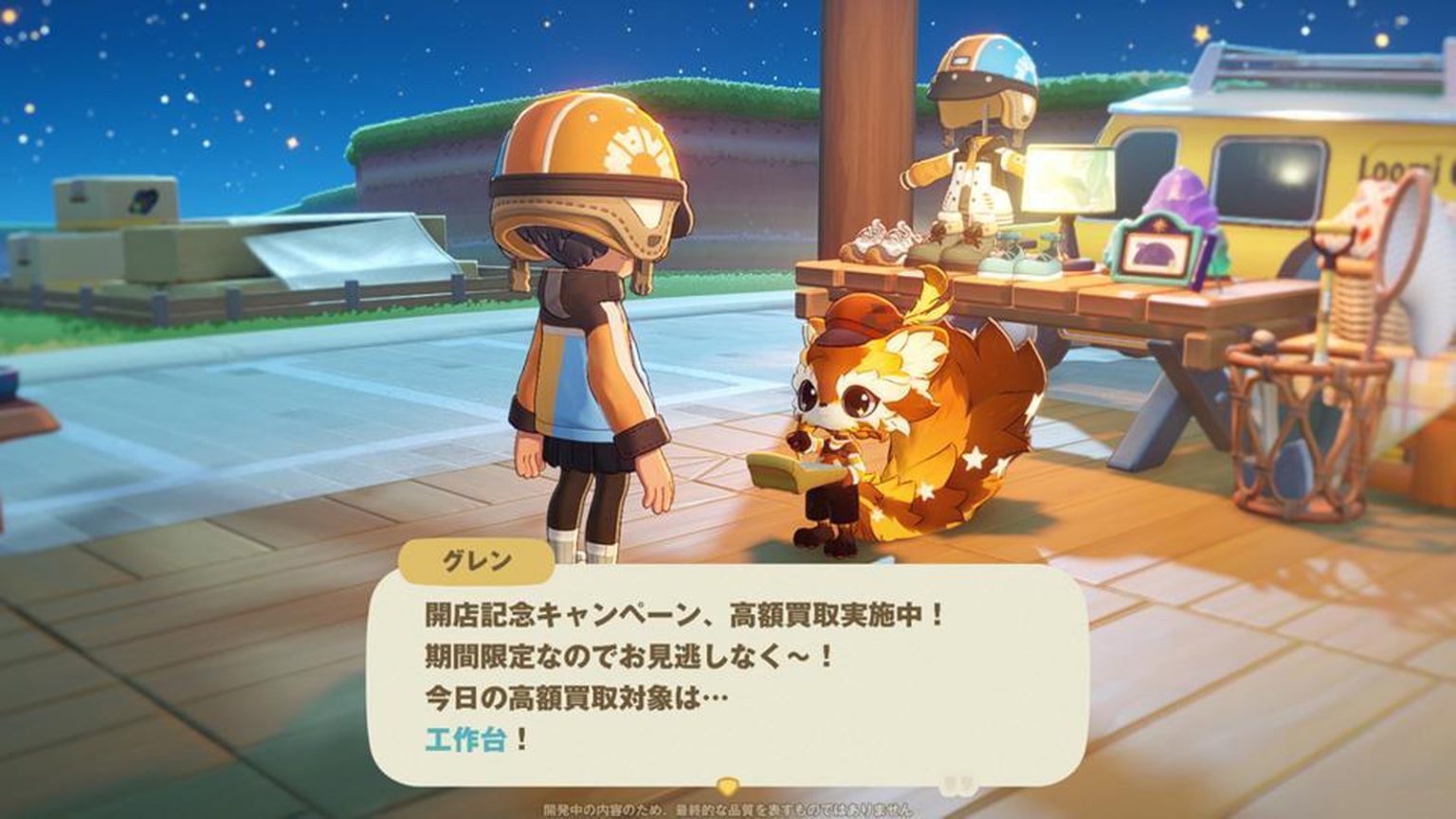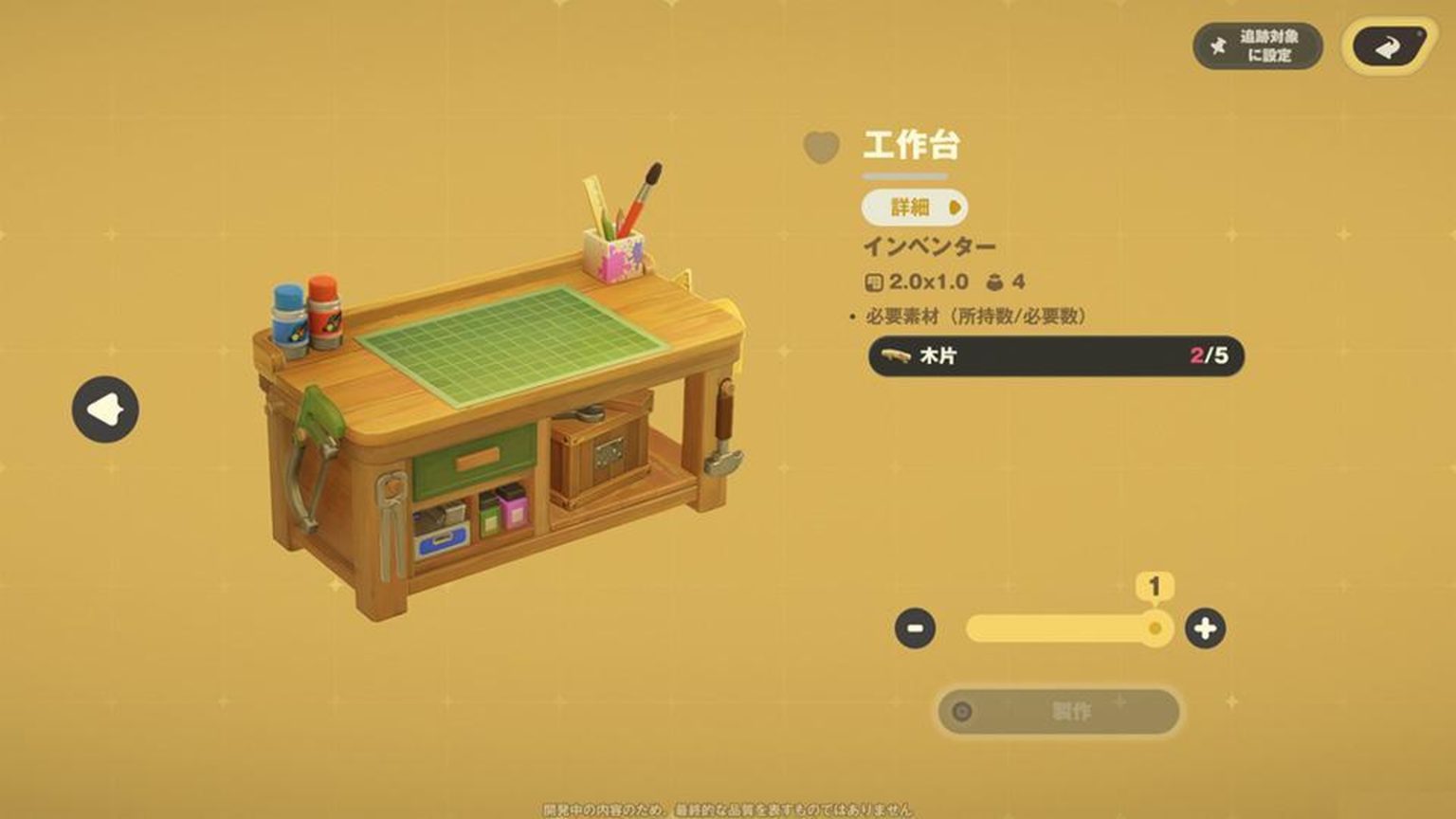 好了,巡游了几个星球,获得了大量的素材。我轻车熟路地站在工作台(已经做好的那个)前,开始大量制作工作台(即将卖掉的那些)。总共做好了6个工作台。那么,合计能赚多少钱呢……我喜滋滋地站在商店进行交涉。正要交易时,我注意到有些不对劲。只能选择1个工作台。咦?难道高价收购家具,只能收购1个吗?注意到的时候已经为时已晚。手边剩下的是横跨宇宙量产的5个工作台。明智的读者玩家们,请务必注意。