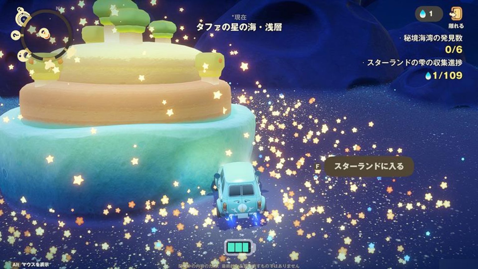 在星之海的旅途中,你会一边消耗电池一边探索地图。如果发现各处的“星之地”,就靠近并进入吧。在星之地,你可以获得平时在自己星球上看不到的植被、虫子和鱼。如果想充实万象馆,这是不可错过的要点。有时会有能获得稀有物品的宝箱和无人商店,还能找到名为“星之雫”的隐藏物品。收集星之雫可以升级车辆电池、开拓新区域,所以务必不要错过。