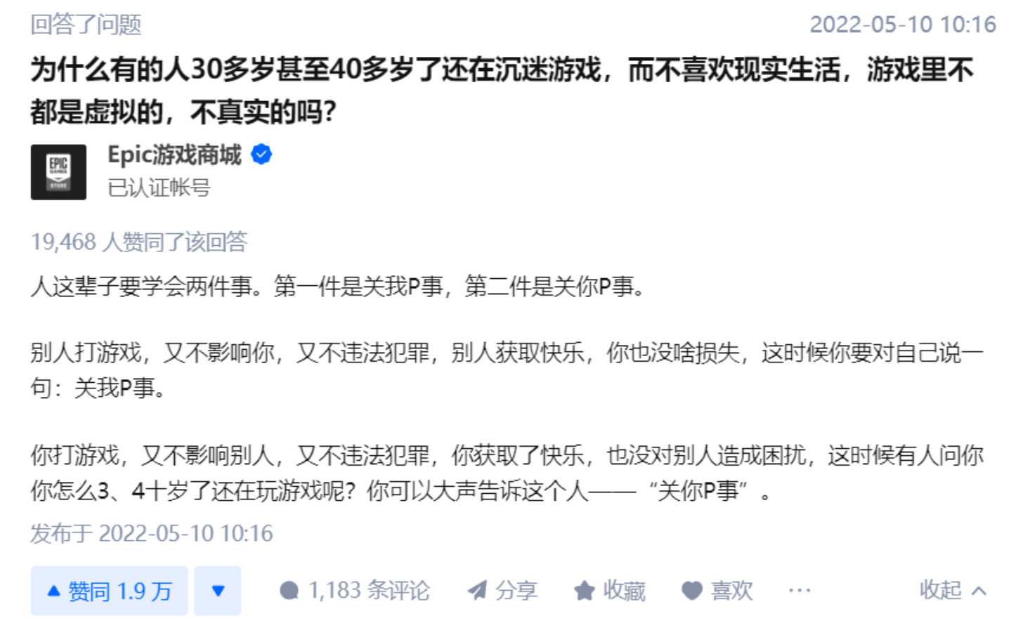 这位Epic国区运营曾创造了很多经典的神回复,例如在针对知乎上一条“为什么三四十岁还沉迷游戏”的问题下Epic游戏商城回应称,沉迷游戏与上进心之间并无必然联系,并幽默表示自己“一直在做亏本买卖”。有玩家问到你最喜欢的八个字,这位运营回答“可以不玩,不能没有”。给玩家们留下了深刻的印象。